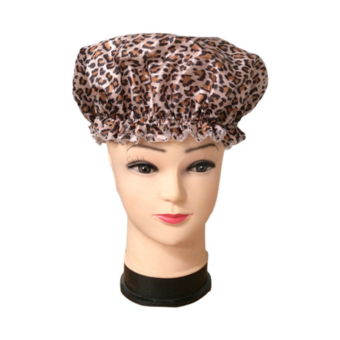 Venta caliente impermeable doble capa leopardo gorros de ducha baño gorras perfecto para mujeres pelo largo
